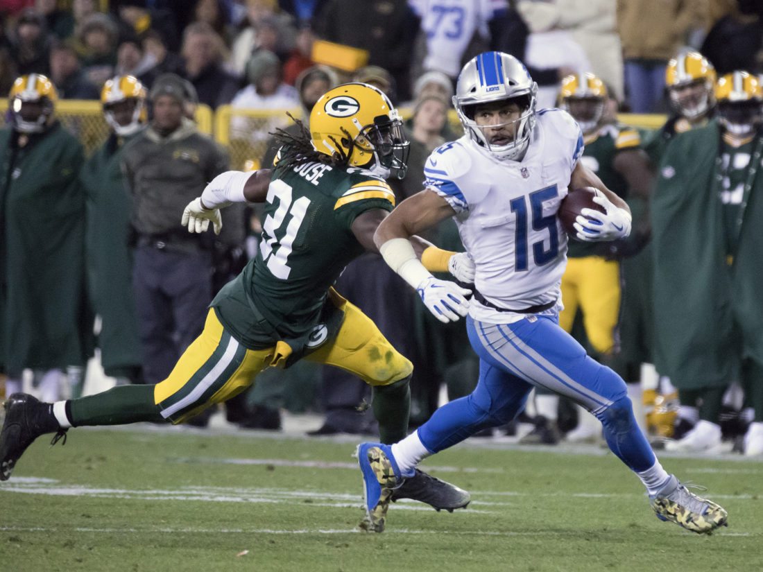 Detroit Lions wide receiver Golden Tate (15) runs with the ball as Green Bay Packers cornerback Davon House (31) defends on Monday, Nov. 6, 2017, in Green Bay, Wis. (Adam Niemi/Iron Mountain Daily News)