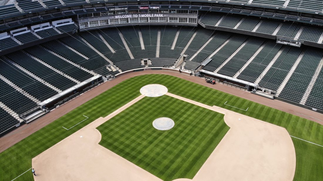 AP Photo IN AN OTHERWISE empty ballpark, grounds crew members continue to keep the Seattle Mariners' field in playing shape as baseball goes into its seventh week without play because of the coronavirus outbreak, Monday, in Seattle.