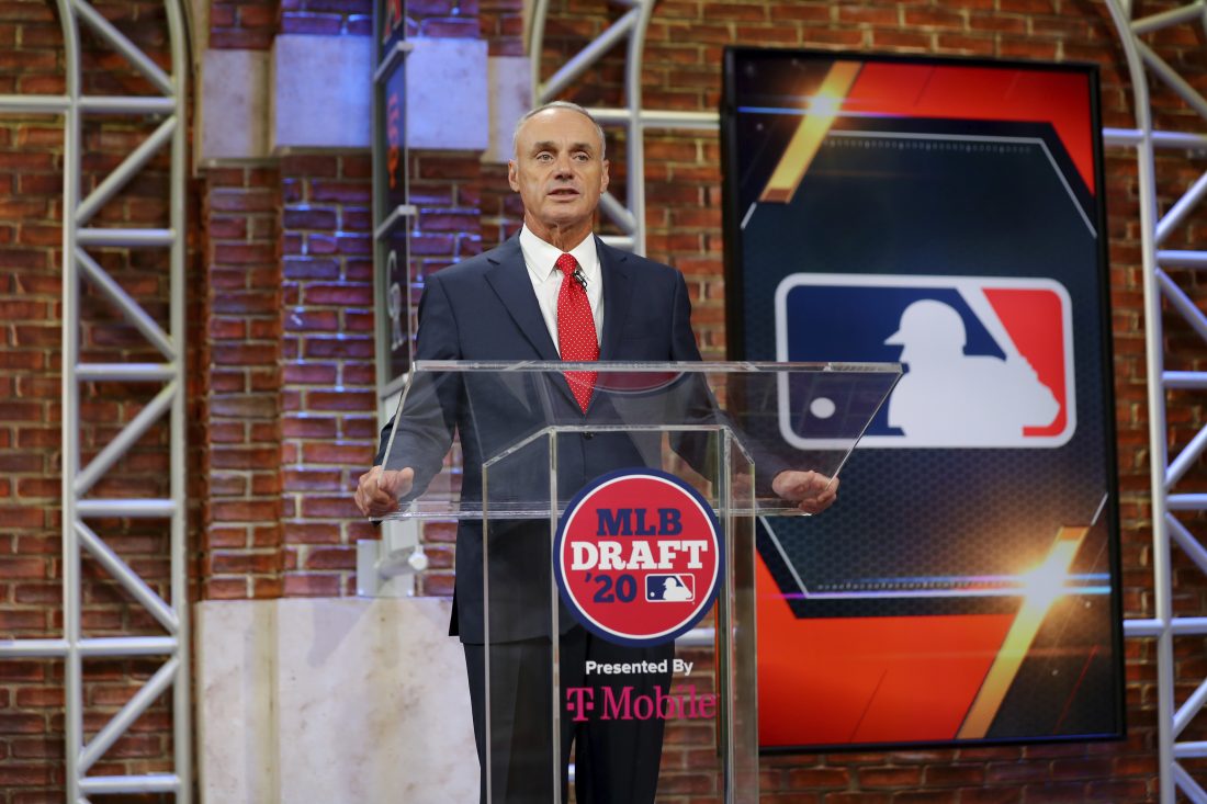 Baseball Commissioner Robert D. Manfred Jr. makes an opening statement during the baseball draft Wednesday in Secaucus, N.J. (Alex Trautwig/MLB Photos via AP)