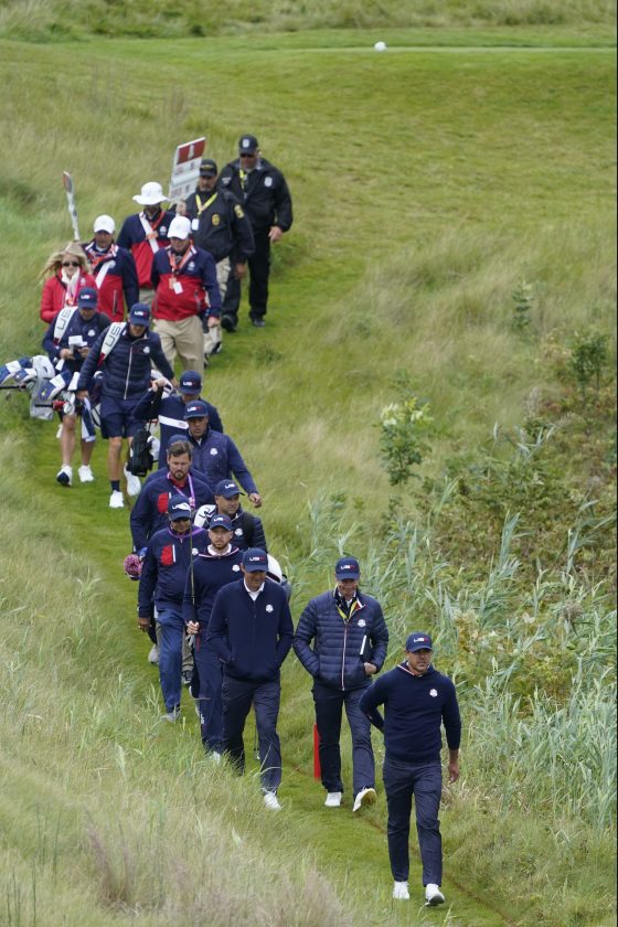 Team USA's Brooks Koepka and other team USA members walk off the 10th tee during a practice day at the Ryder Cup at the Whistling Straits Golf Course Wednesday, Sept. 22, 2021, in Sheboygan, Wis. (AP Photo/Charlie Neibergall)
