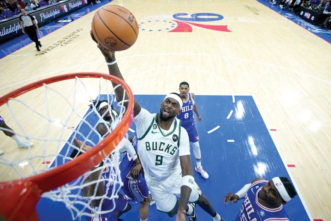 Milwaukee’s Bobby Portis (9) goes up for a shot during the first half of the Bucks’ season-opener on Thursday against the host Philadelphia 76ers. (Matt Slocum/AP photo)