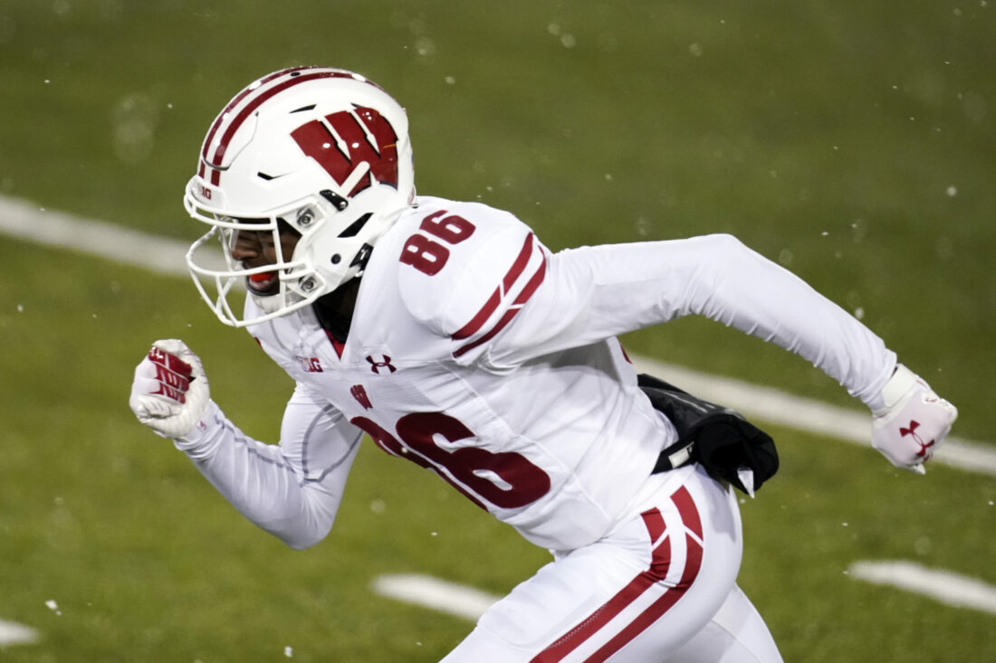 FILE - Wisconsin wide receiver Devin Chandler runs up field during an NCAA college football game against Iowa, on Dec. 12, 2020, in Iowa City, Iowa. Chandler, who transferred to the University of Virginia, was one of three Virginia football players killed in a shooting, Sunday, Nov. 13, 2022, in Charlottesville, Va., while returning from a class trip to see a play. (AP Photo/Charlie Neibergall, File)