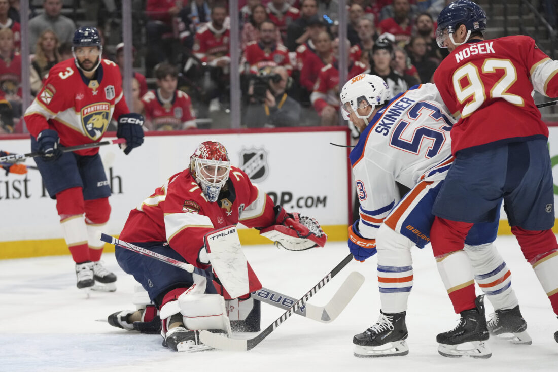 Florida Panthers goaltender Sergei Bobrovsky (72) protects the net as Edmonton Oilers center Jeff Skinner (53) passes the puck during the first period of Game 6 of the NHL hockey Stanley Cup Final Tuesday, June 17, 2025, in Sunrise, Fla. (AP Photo/Lynne Sladky)