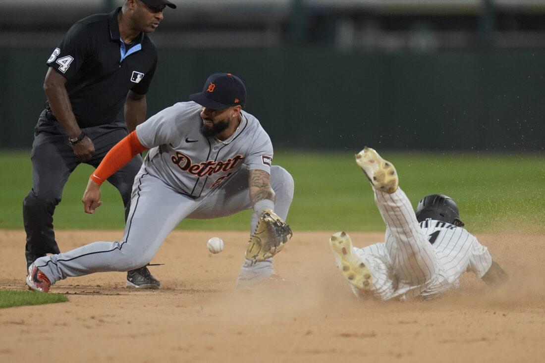 Detroit Tigers second baseman Gleyber Torres (25), left, can't catch Chicago White Sox's Michael A. Taylor (21) as he steals second during the eighth inning of a baseball game Tuesday, June 3, 2025, in Chicago. (AP Photo/Erin Hooley)