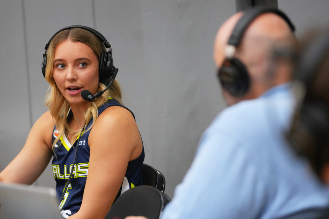 Dallas Wings' Paige Bueckers talks to a radio host during the team's WNBA media day Monday in Arlington, Texas. (AP Photo/Julio Cortez)