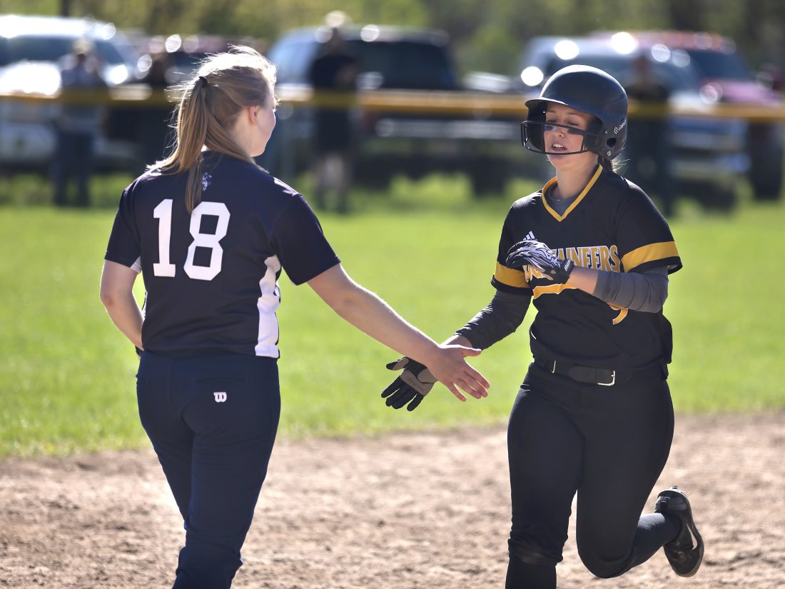 Iron Mountain's Jorden Stoner, right, is congratulated by Norway's Ada VanHolla after Stoner hit a walkoff two-run home run for an 8-7 victory on Monday, May 20, 2019, in Iron Mountain, Mich. (Adam Niemi/Iron Mountain Daily News)