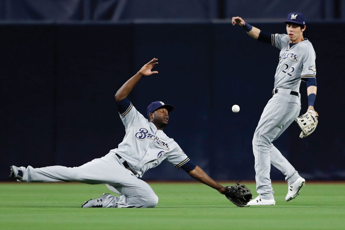 AP Photo | Milwaukee center fielder Lorenzo Cain (6) cannot reach a hit for a double by San Diego’s Hunter Renfroe as right fielder Christian Yelich (22) looks on during the third inning Monday.