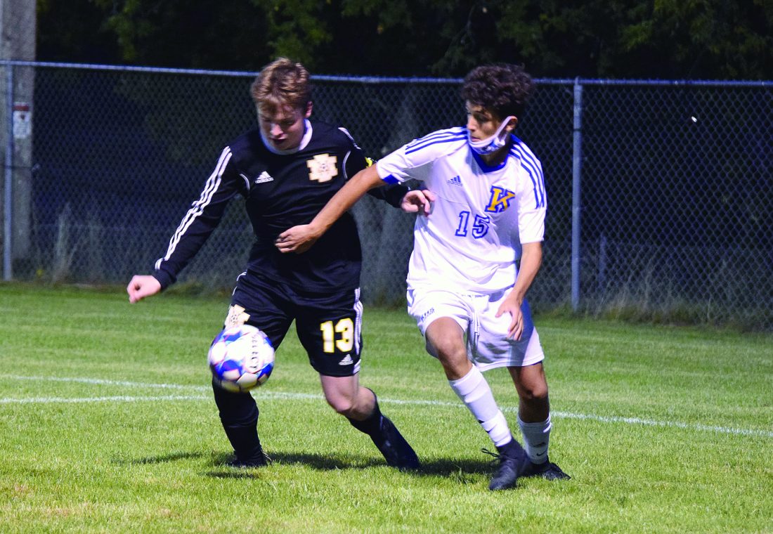 )Angela Anderson photo) IRON MOUNTAIN’S DAVID Juul (13) battles for control against Kingsford’s Cade Counter during the second half of Monday’s high school soccer game at Commemorative Field in Kingsford.