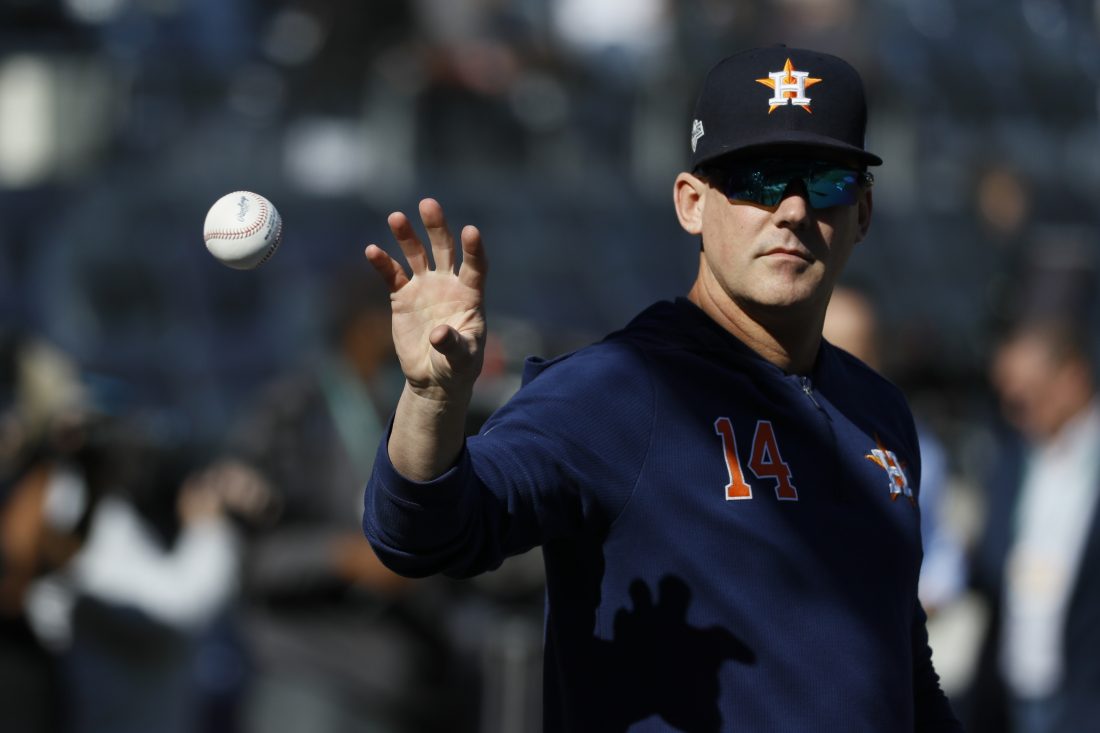 In this Oct. 15, 2019, file photo, Houston Astros manager AJ Hinch (14) reaches for a ball before Game 3 of baseball's American League Championship Series against the New York Yankees in New York. The Detroit Tigers have hired AJ Hinch to be their new manager, giving him a chance to return to a major league dugout after he was fired by Houston in the wake of the Astros’ sign-stealing scandal. (AP Photo/Matt Slocum, File)
