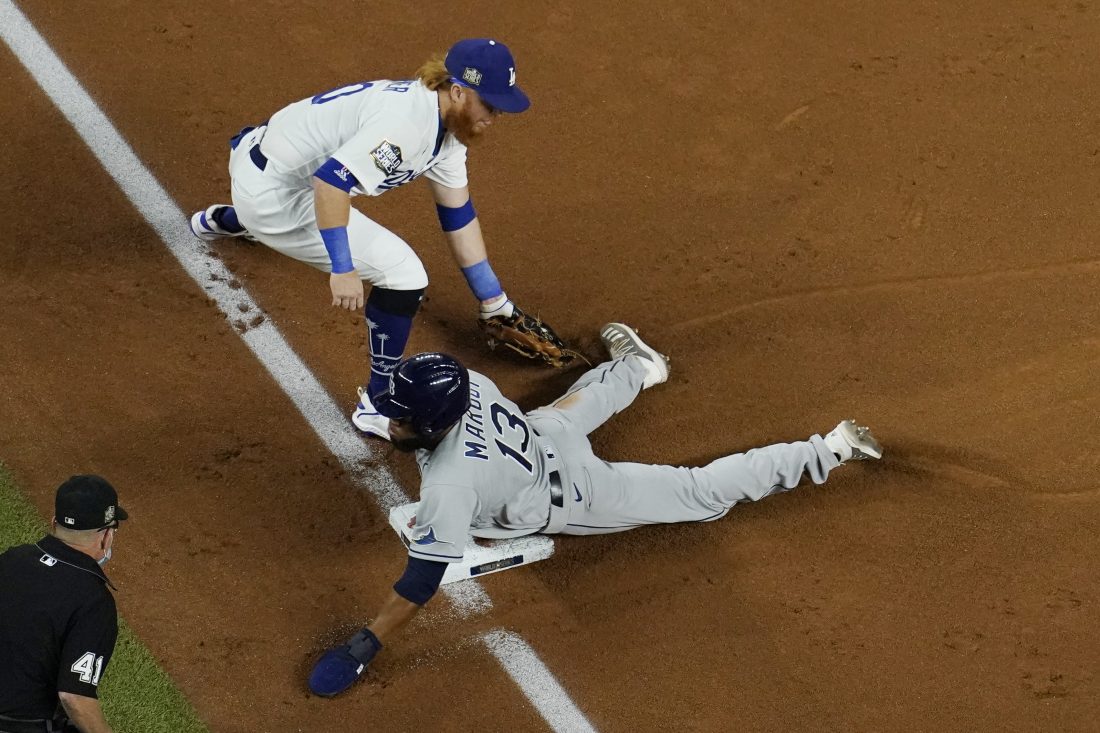 Tampa Bay Rays' Manuel Margot is safe at third past Los Angeles Dodgers third baseman Justin Turner on a ball hit by Joey Wendle during the second inning in Game 2 of the World Series Wednesday in Arlington, Texas. (AP Photo/David J. Phillip)