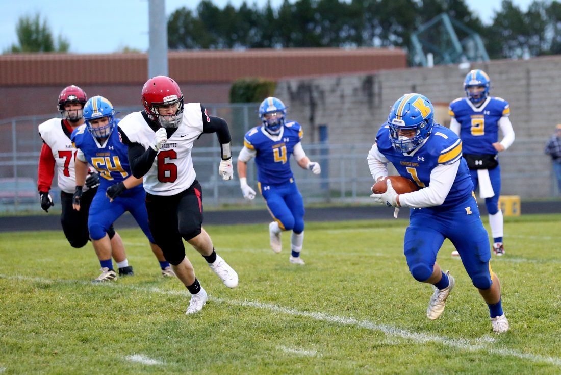 On Kingsford’s first possession, a Carter Kreski fumble was recovered by Desmond Mullen of the Redmen. Marquette’s ensuing drive began with quarterback Austin Ridl getting sacked by Kingsford’s Zach Person.
