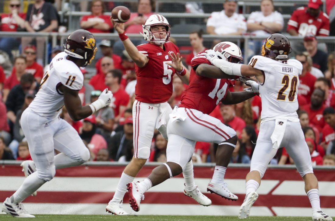 (AP Photo) Wisconsin's Graham Mertz throws during the second half of a game against Central Michigan in Madison, Wis. on Sept. 7, 2019. Central Michigan defensive back and St. Ignace native Gage Kreski (20) attempts to shed a Wisconsin blocker. Mertz is about to get his chance to show he’s worthy of all the acclaim that accompanied his arrival on campus last year. Foot surgery has sidelined returning starter Jack Coan indefinitely.