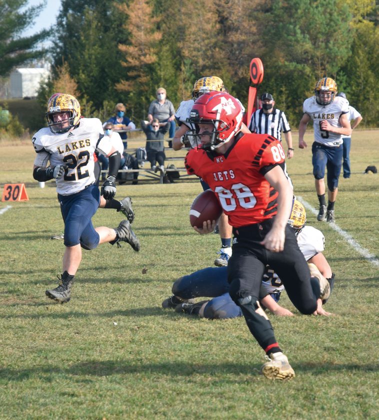 North Central’s Alex Naser (88) cuts upfield on his way to a touchdown against Lake Linden-Hubbell Saturday in Powers during an eight-player regional semifinal. (Justin St. Ours/Daily Press photo)