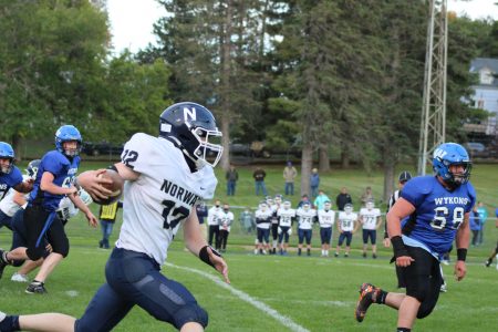 - (Theresa Proudfit/Daily News photo) West Iron senior Nathan Lundin (68) runs at an angle to make a play on Norway ball carrier Gannon Bray (12), in a game at Nelson Field in Stambaugh on Sept. 18. Lundin was named the 2020 Mitchell Synder Lineman of the Year; the first Wykon to be named UP Lineman of the Year since 1977.