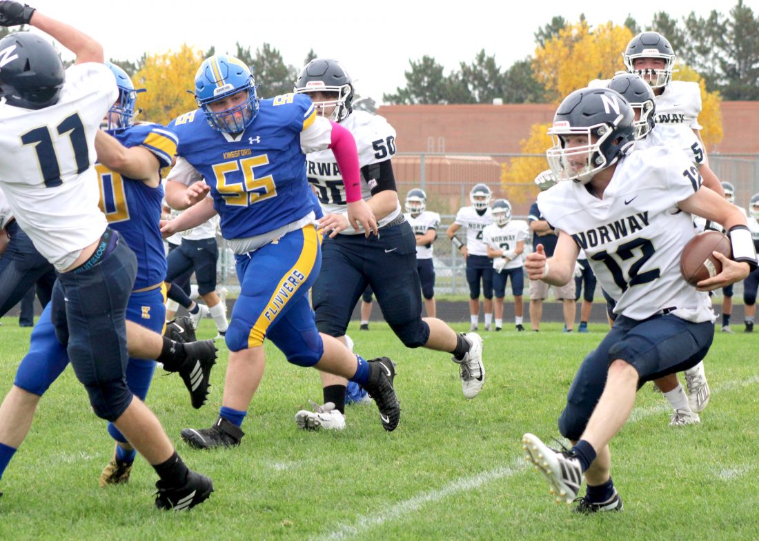 - (Theresa Proudfit/Daily News photo) Kingsford defensive lineman Lucas Tappy (55) pursues Norway quarterback Gannon Bray (12) in a non-conference game Sept. 26 at Flivver Field in Kingsford.