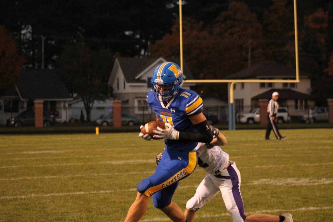 (Theresa Proudfit/Daily News photo) Kingsford wide receiver Zach Person (11) hauls in a pass in a Great Northern Conference game versus Gladstone at Flivver Field on Oct. 9.