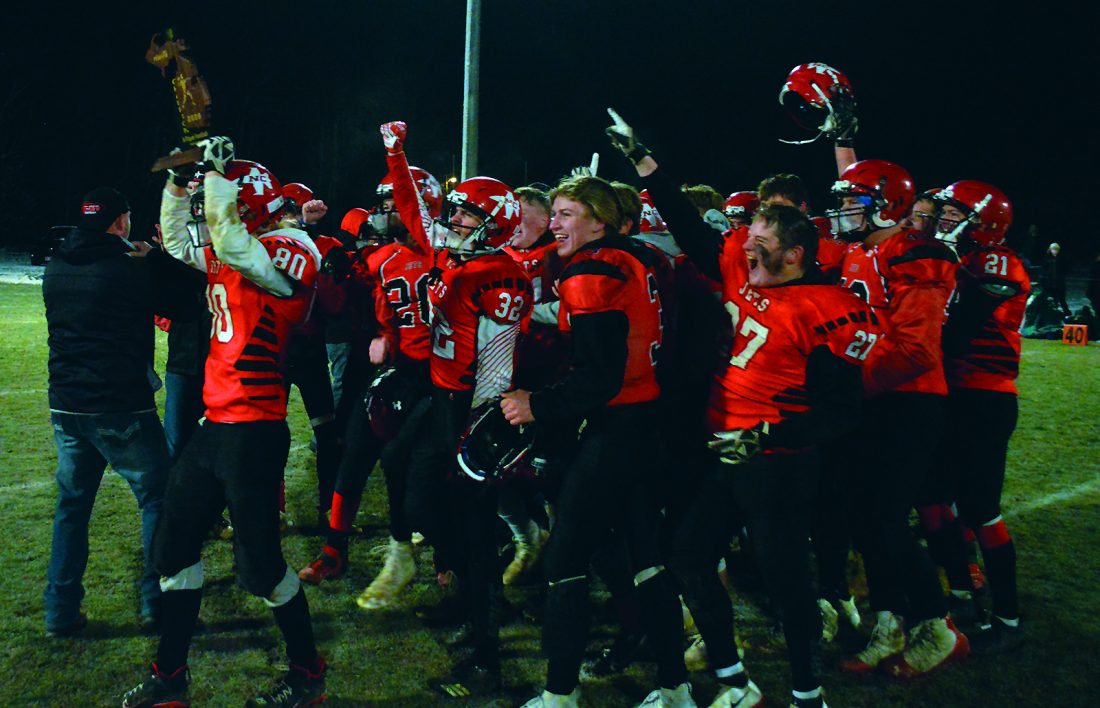 (Todd Rose/ Escanaba Daily Press photo) North Central’s Carter Eichmeier (80) holds up the regional championship trophy as his teammates celebrate behind him after defeating Cedarville, Nov. 13 in Powers. The Jets were selected unanimously as the 2020 8-player U.P. Team of the Year by the Upper Peninsula Sportswriters and Sportscasters.