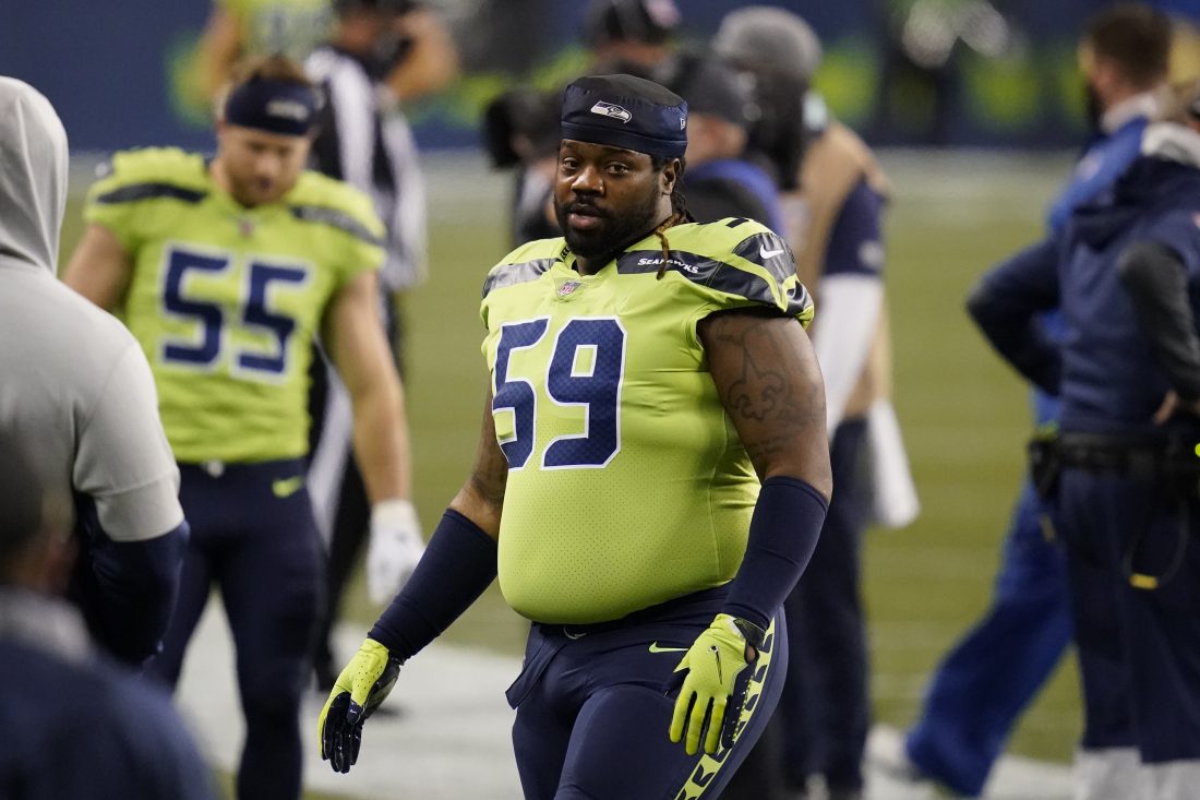 Seattle Seahawks' Damon Harrison stands on the field before an NFL football game against the Arizona Cardinals, Thursday, Nov. 19, 2020, in Seattle. (AP Photo/Elaine Thompson)