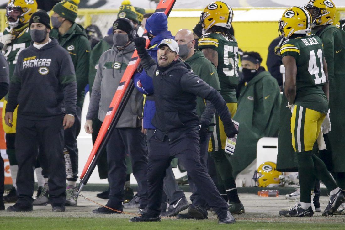 Green Bay Packers head coach Matt LaFleur reacts after a pass interference call was made against Green Bay during the second half of the NFC championship NFL football game against the Tampa Bay Buccaneers in Green Bay, Wis., Sunday, Jan. 24, 2021. (AP Photo/Mike Roemer)