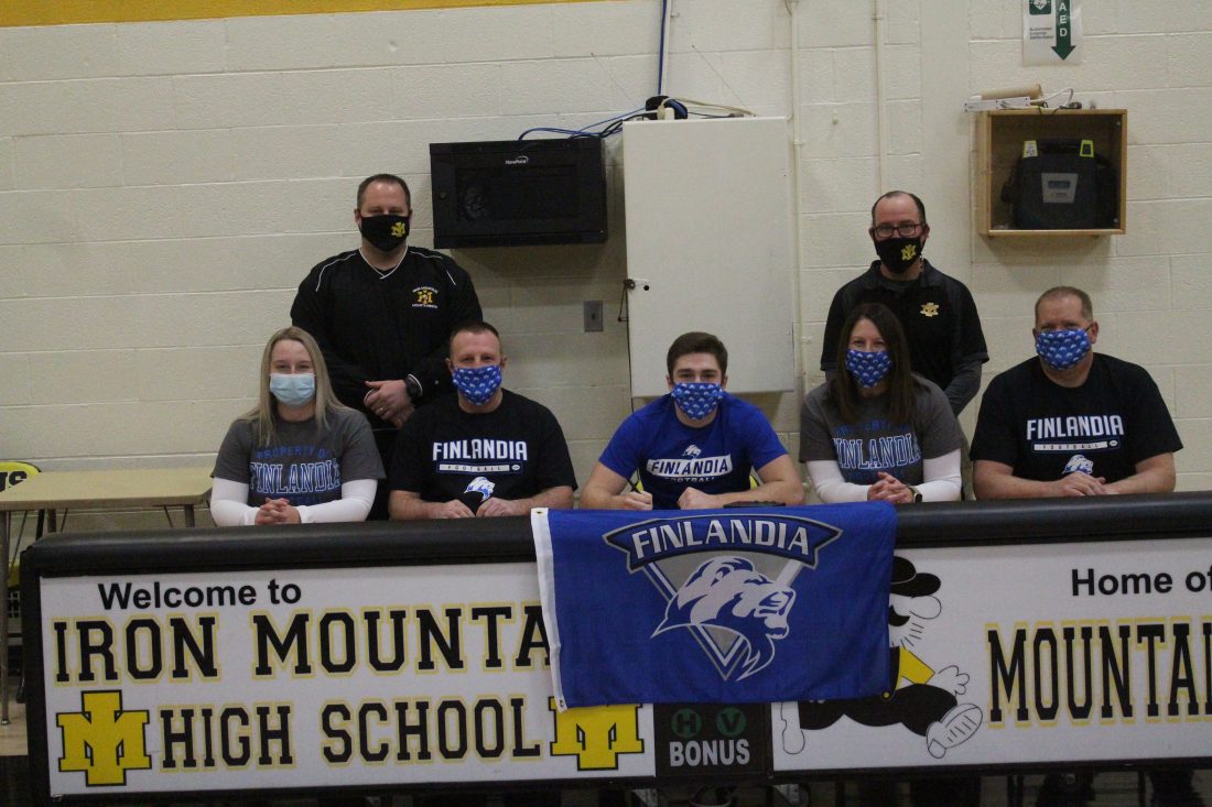 Iron Mountain senior Caleb Evosevich-Hynes, center, signed a Division III Student-Athlete Celebratory Signing Form on Monday to play football at Finlandia University in Hancock. Joining Evosevich-Hynes in the Mountaineer gymnasium are, from left, his sister Riley Paupore; his father Dick Hynes; his mother Kelly Paupore; and step-father Jason Paupore. In back are Mountaineers head football coach Robin Marttila, left, and athletic director Donny Bianco. Evosevich-Hynes said the coaching staff at Finlandia wants him to play free safety. He intends on majoring in sports management. Evosevich-Hynes said he wouldn’t be in the position to play college football without his coaches and teammates, and he expressed his appreciation.