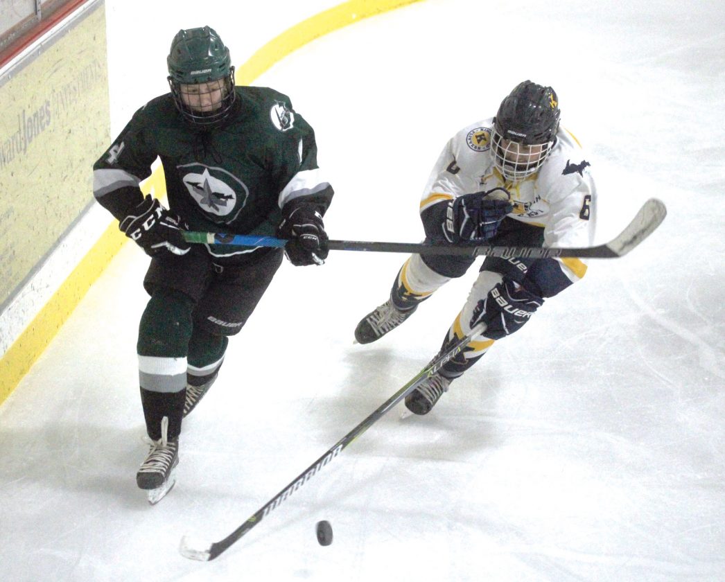 - Jeffers defenseman Kyle Heltunen (4) and Kingsford forward Carter Kreski (6) compete for the puck Thursday at Mountain View Ice Arena in Iron Mountain. Kreski tallied a goal and three assists in Kingsford’s 6-3 win. (Theresa Proudfit photos)
