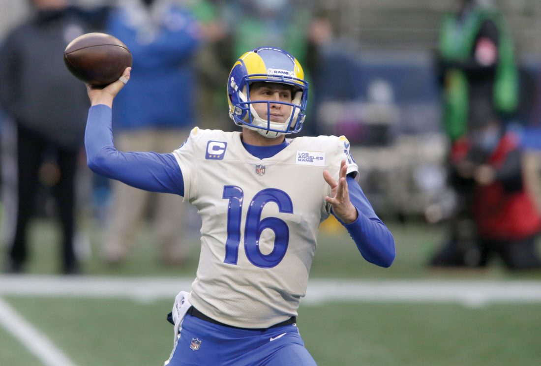- Los Angeles Rams quarterback Jared Goff throws a pass against the Seattle Seahawks during the first half of an NFL wild-card game in Seattle on Jan. 9. (AP Photo)