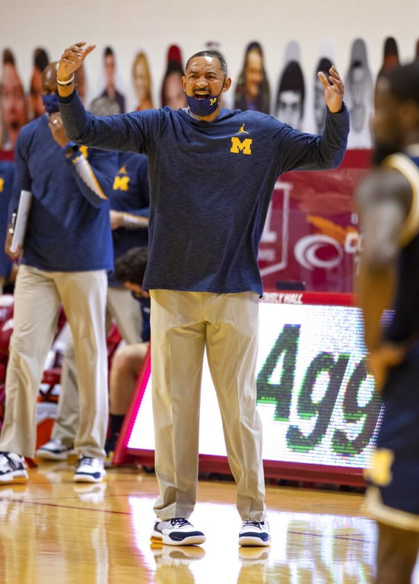 - Michigan head coach Juwan Howard reacts to a call by the game officials during the first half of an NCAA college basketball game against Indiana, Saturday, Feb. 27, 2021, in Bloomington, Ind. (AP Photo/Doug McSchooler)