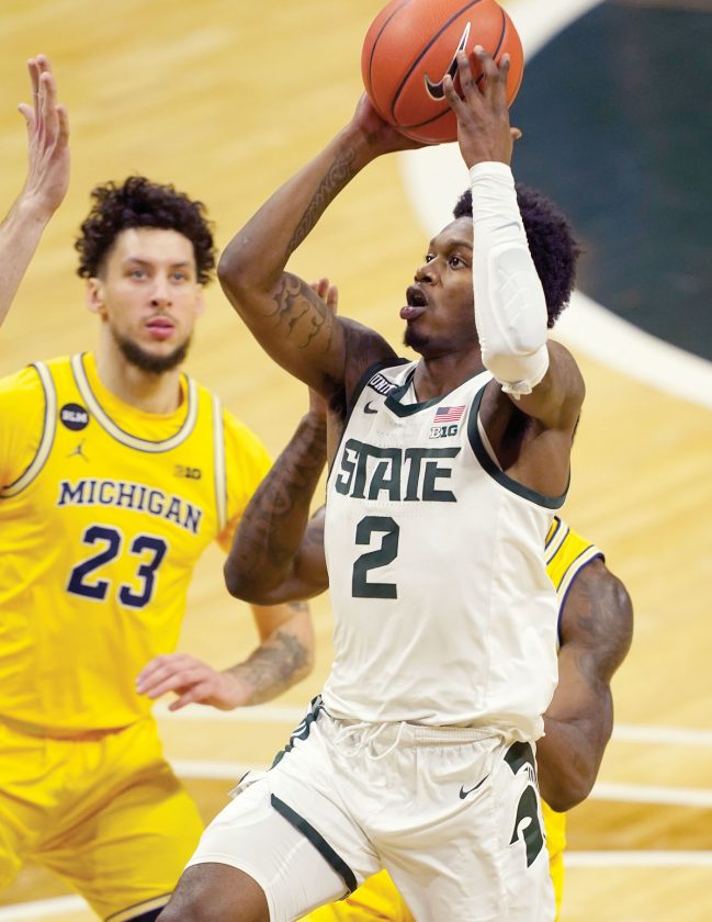 Michigan State guard Rocket Watts (2) attempts a shot during the second half against Michigan on Sunday. (AP Photo)