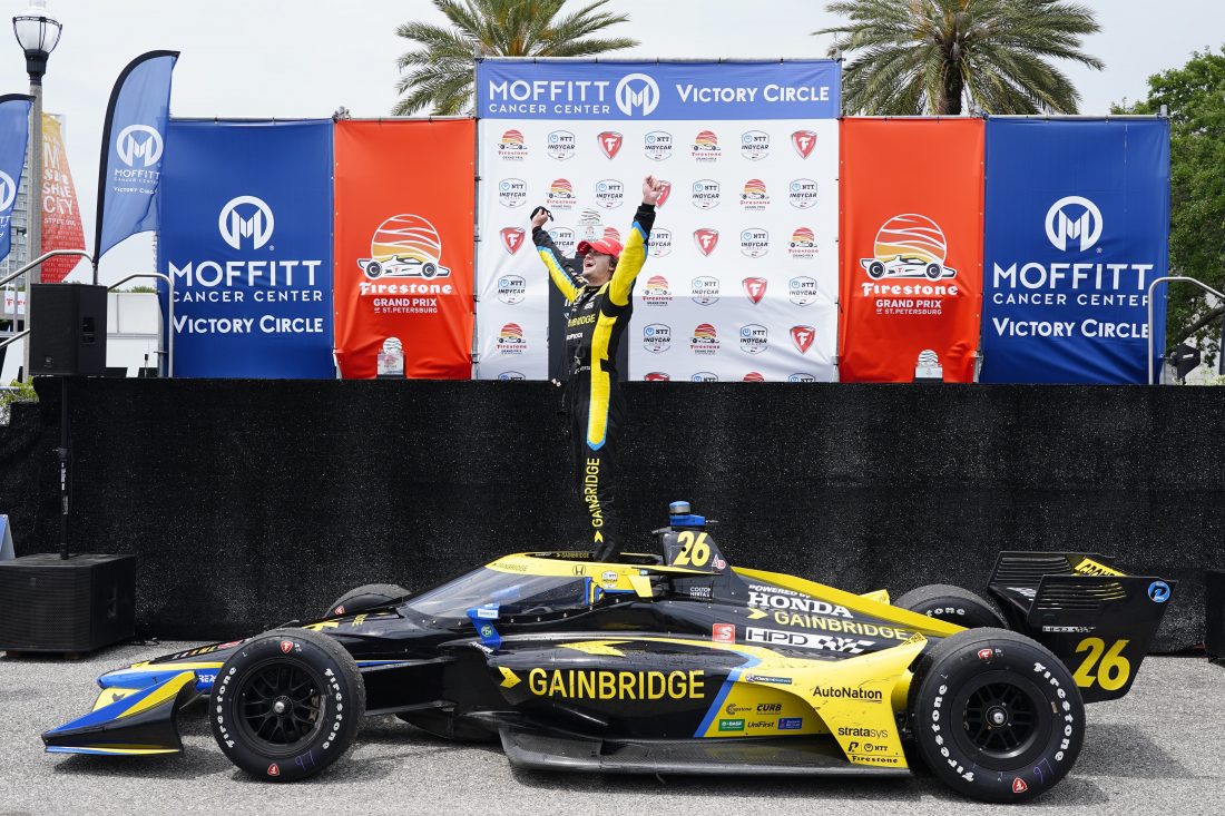 IndyCar driver Colton Herta celebrates after winning the Grand Prix of St. Petersburg, Sunday, April 25, 2021 in St. Petersburg, Fla. (Luis Santana/Tampa Bay Times via AP)