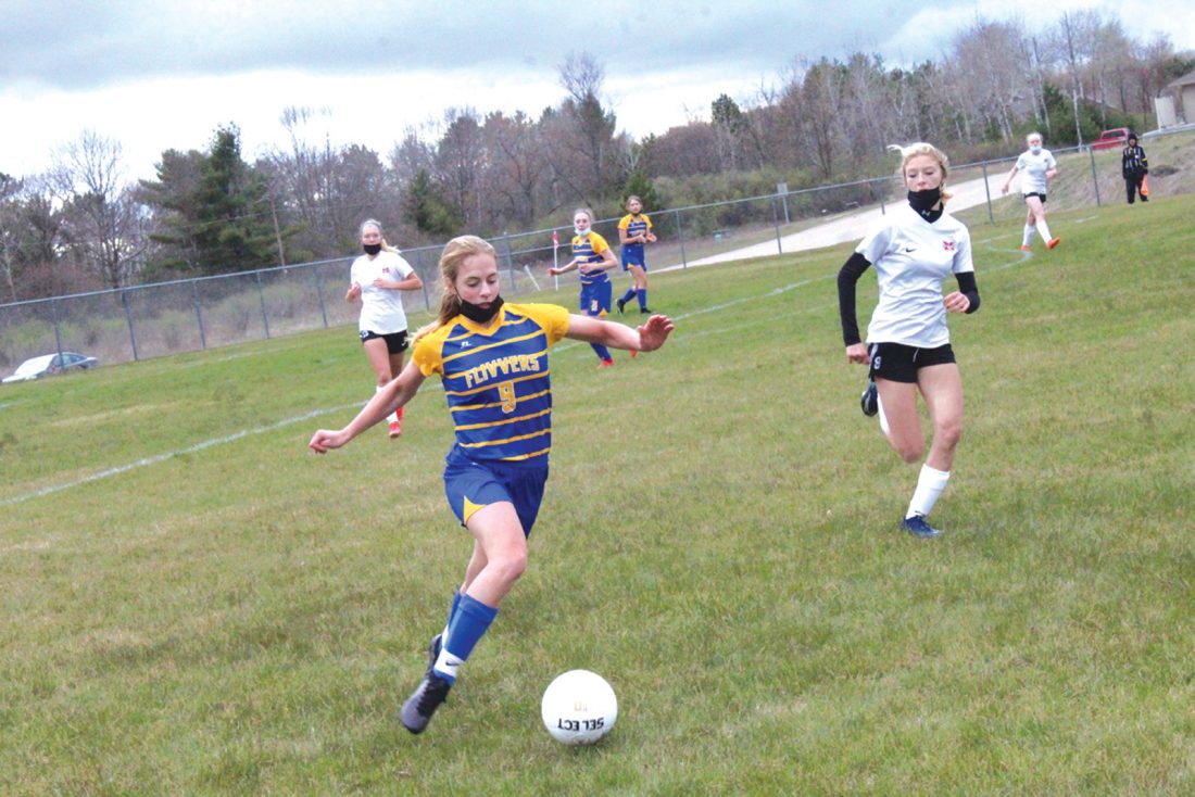 (Matt McCarthy/Daily News photo) Kingsford sophomore Lexie Vross (9) moves the ball against Marquette on Thursday at Commemorative Field in Kingsford. The Flivvers and Redettes tied 2-2 in Kingsford’s opening game of the season.