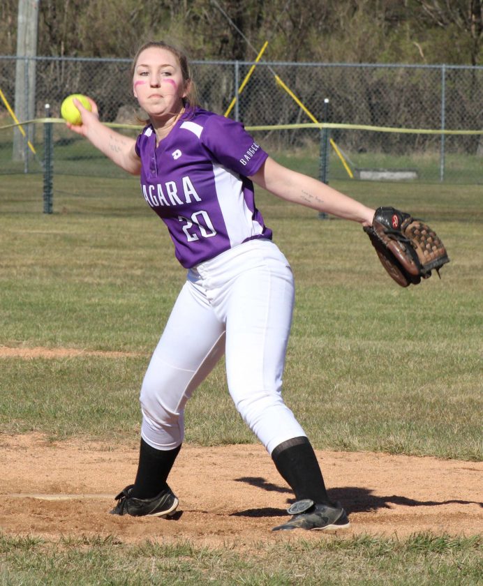 (Theresa Proudfit photo) Niagara senior pitcher Noelle Champagne winds up to throw a pitch versus Florence on April 30. Champagne fanned eight batters in six and two-thirds innings on Monday versus Wausaukee in a WIAA Division 5 regional game at Riverside Field in Niagara.