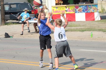- (Matt McCarthy/Daily News photo) Mac Hoffman of Brussels, Wis., passes the basketball to a teammate over the outstretched arms of defender Brock Baldwin of Norway (6). Hoffman captained his team, the Southern Door Swishers, as they defeated Baldwin’s Norway Knights in a game Saturday afternoon on Court B.