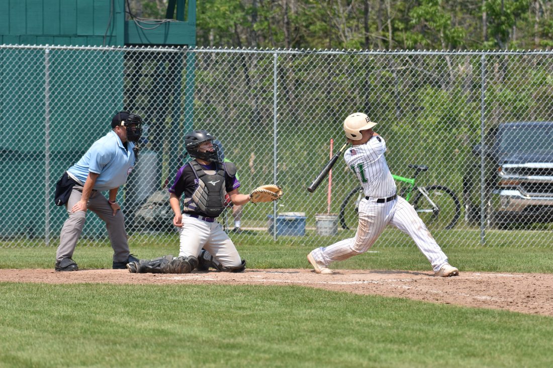 (Betsy Bloom/Daily News photo) Dickinson County Green’s Blake Julian (11) swings at a pitch in Saturday morning’s American Legion baseball game versus the Niagara junior Legion team at Felch Memorial Field. Niagara catcher Christian Hedmark and umpire Jim Bal await the pitch. Dickinson County defeated Niagara 9-5 behind a fourth inning grand slam by Julian. Niagara also played the Copper Country on Saturday at Felch, with CC defeating Niagara, 10-3.