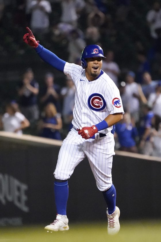Chicago Cubs' Rafael Ortega celebrates his two-run, walk off home run off Colorado Rockies relief pitcher Daniel Bard during the ninth inning of a baseball game Monday, Aug. 23, 2021, in Chicago. The Cubs won 6-4.(AP Photo/Charles Rex Arbogast)