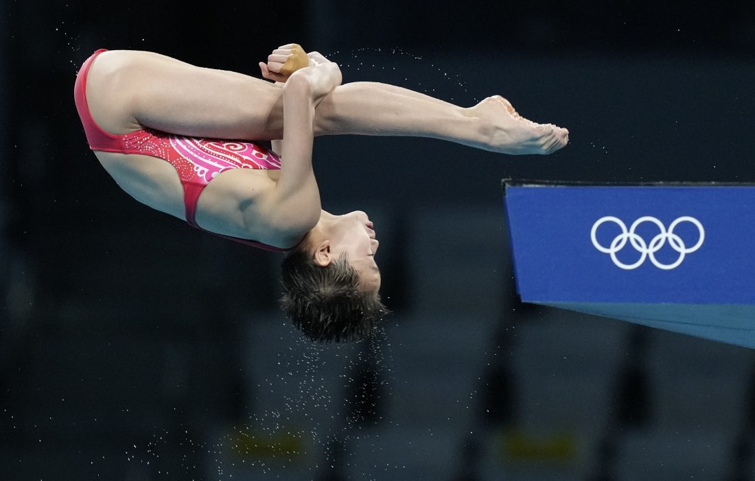 Quan Hongchan of China competes Thursday in the women’s diving 10m platform final at the Tokyo Aquatics Centre. Quan, who won the gold medal, earned perfect 10s for her second and fourth dives in the five-round competition. (AP Photo/Dmitri Lovetsky)