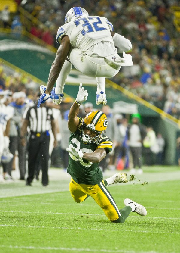 (Jason Juno/Ironwood Daily Globe photo) RUNNING BACK D’Andre Swift of the Detroit Lions jumps over Green Bay Packers cornerback Kevin King Monday night at Lambeau Field.