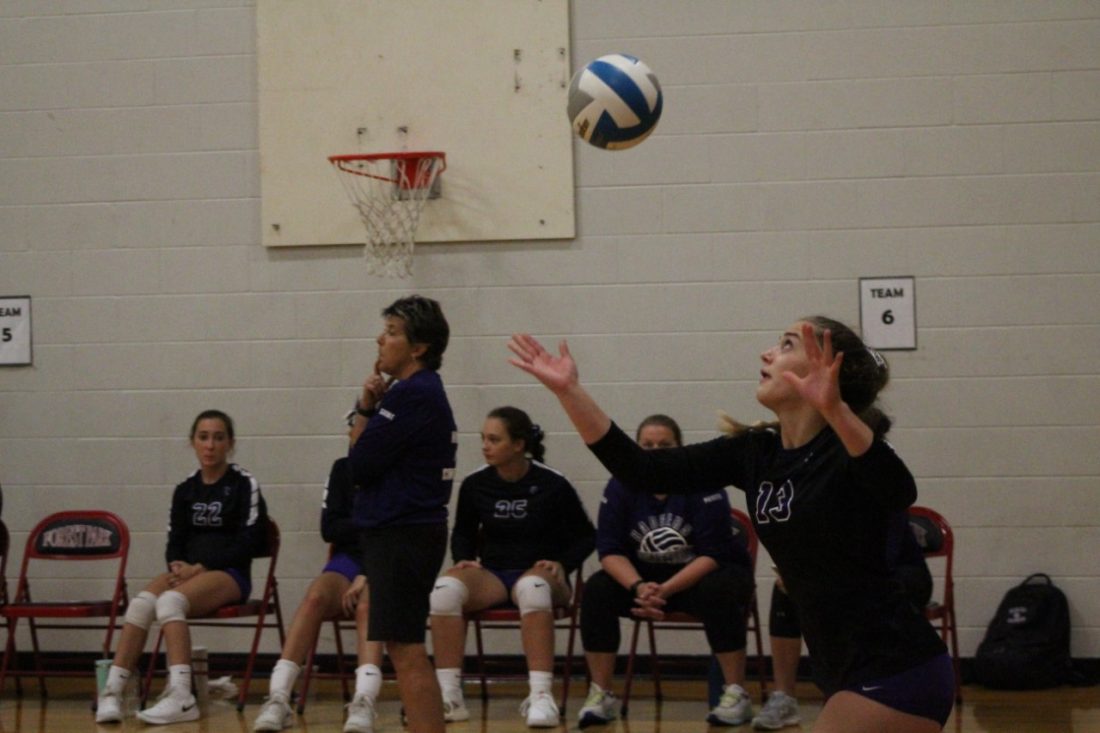 (Matt McCarthy/Daily News photo) Niagara junior Morgan Borchardt (13) prepares to serve the ball as head coach Carol St. Arnauld looks on in a match in the Forest Park Elementary Gymnasium in the 2021 Great 8 varsity volleyball tournament Aug. 28 at Forest Park Schools. Borchardt was selected as the Marinette & Oconto Conference Player of the Year.