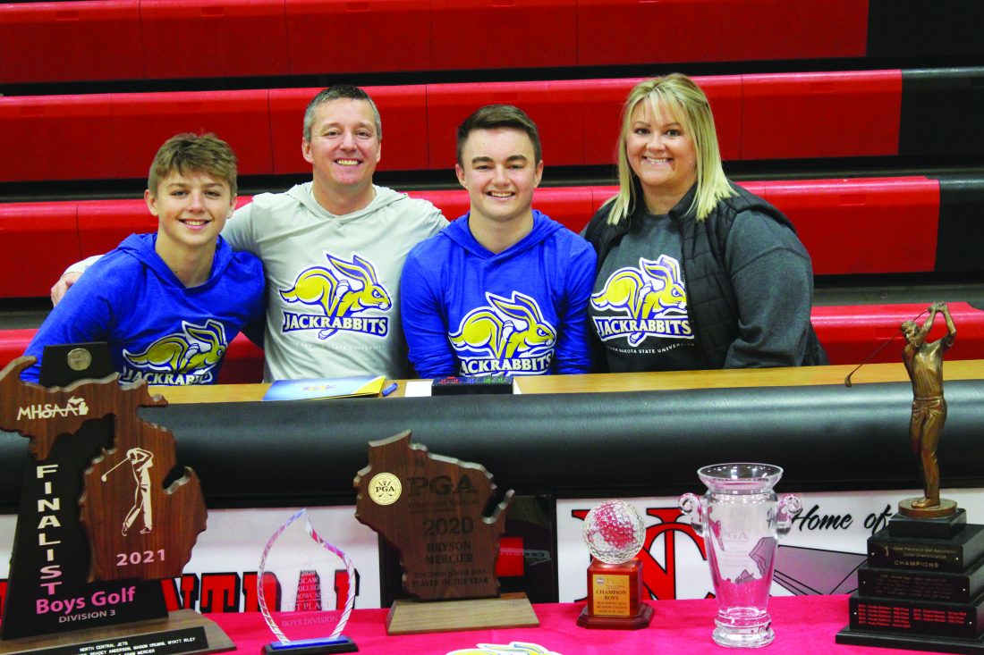 (Matt McCarthy/Daily News photos) North Central senior golfer Bryson Mercier poses with his family after signing his national letter of intent to play Division I college golf at South Dakota State, Thursday at North Central High School. Pictured with Mercier, from left, are his brother Brody Mercier, and parents, Adam and Melissa Mercier.