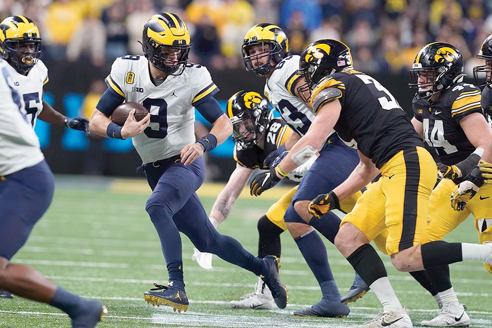 Michigan quarterback J.J. McCarthy (9) runs from Iowa linebacker Jack Campbell (31) during the second half of the Big Ten championship Dec. 4. The victory set up Michigan’s upcoming challenge on Friday night, when the Wolverines face Georgia in the Orange Bowl. (Darron Cummings/AP photo)