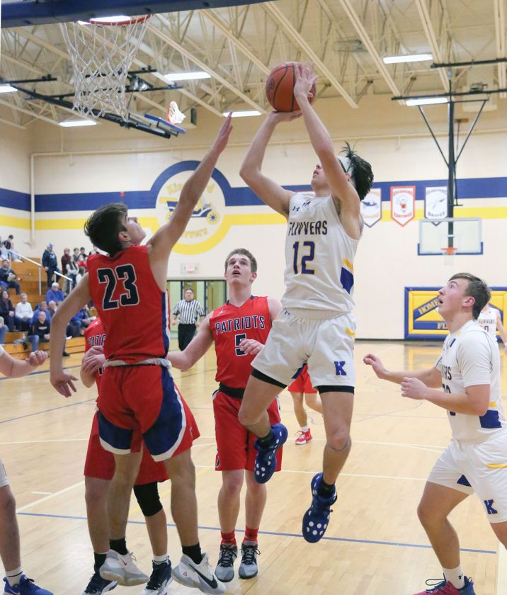Kingsford cager Brody Kopp (12) goes up and over a Westwood defender for a two-point shot in boys varsity basketball action Friday night. The host Flivvers topped Westwood 72-59 in the nonconference clash. (Terry Raiche photo)