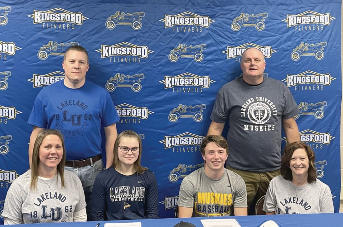 A pair of Kingsford High School seniors will go from being Flivvers to Muskies next fall, having recently accepted offers to continue their respective sports careers at Division III Lakeland College in Plymouth, Wis. Paige Olsen will move on from KHS and play basketball for the Lady Muskies, where she will be joined by Sawyer Pugh, who is slated to play baseball, according to Chris Hartman, Kingsford’s director of athletics. Above, front center, new Muskies Paige Olsen and Sawyer Pugh, are joined by their respective parents, Laura Olsen and Tim Olsen and Cheryl and Mark Pugh, during a recent signing ceremony.