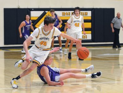 - (Dennis Mansfield/Daily News photos) Iron Mountain junior forward James Chartier (40) tries to gain control of the ball and head down court for a potential basket after knocking it away from Gladstone sophomore Drake Johnson (34) in first-half action on the Mountaineers’ home floor Monday night. Iron Mountain won the clash of the two varsity foes 48-34.
