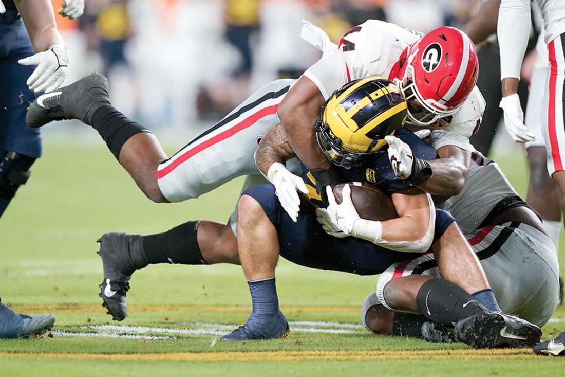 Michigan running back Blake Corum is tackled by Georgia defensive lineman Travon Walker during the first half of the Orange Bowl NCAA College Football Playoff semifinal game Friday night in Miami Gardens, Fla. (Lynne Sladky/AP photo)