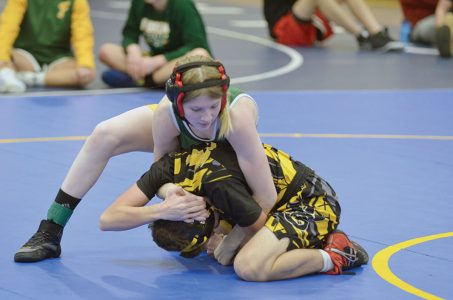 (Dennis Mansfield/Daily News photo) Florence wrestler Sophia Wagner takes control of her Bark River-Harris opponent during a match Saturday at the Kingsford Invitational. Wagner took second after moving up from 103 to 112. She finished the day with a 3-1 mark.
