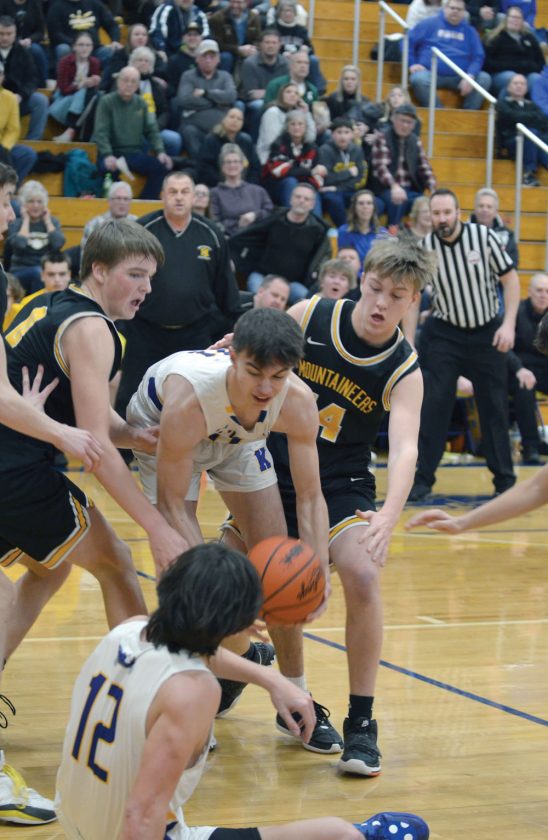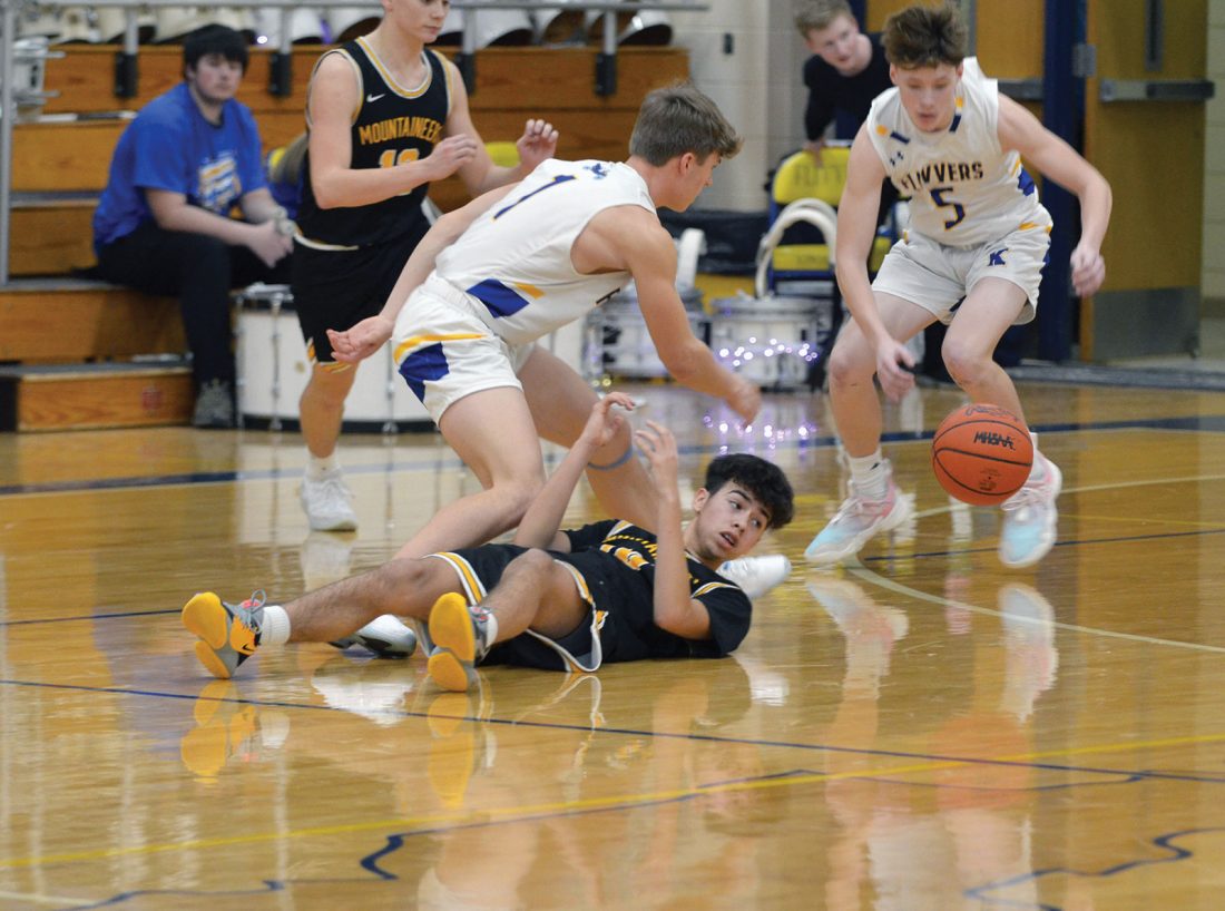 Intense defensive pressure from Kingsford guard Cole Myllyla (1) literally knocked over Iron Mountain freshman Gerald Sampoll Torres (10) and caused a turnover picked up by fellow Flivver Gavin Grondin (5) during the rematch of the neighboring teams on Tuesday night. Myllyla, along with guardmate Nic Nora, made big plays down the stretch to seal the 53-46 victory over the Mountaineers. (Dennis Mansfield/Daily News photo)