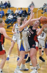 Forest Park’s Gracie Peterson (42) hauls down a rebound after a battle with Kingsford’s Abby Terrian (10) and Laura Bracket (12). The Flivvers held Peterson, the Lady Trojans’ top scorer, to just two points in their 42-22 victory.