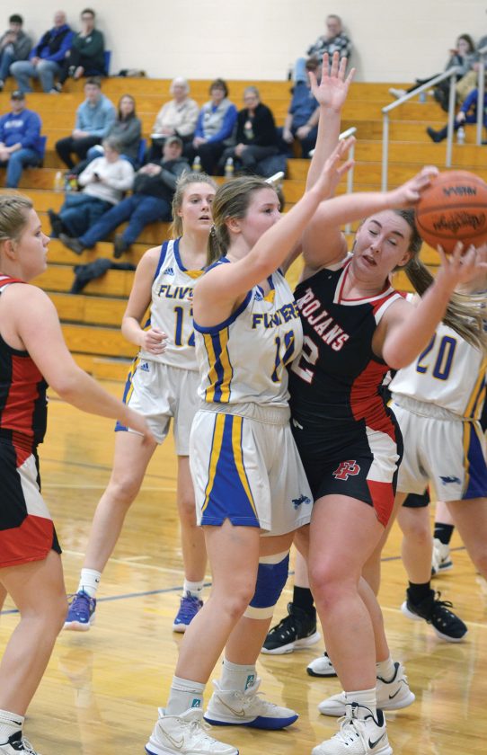 - Forest Park’s Gracie Peterson (42) hauls down a rebound after a battle with Kingsford’s Abby Terrian (10) and Laura Bracket (12). The Flivvers held Peterson, the Lady Trojans’ top scorer, to just two points in their 42-22 victory.