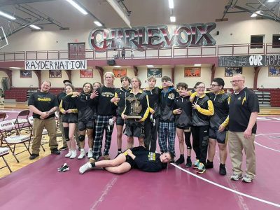 (Courtesy photo) Iron Mountain wrester Isaac Manier, at center, is surrounded by his teammates and the Mountaineers’ coaching staff, as he holds the Division IV, Region 125 championship trophy after Mountaineers’ victories over Bark River-Harris and tournament host Charlevoix on Wednesday. According to coach Cory McLaren, far right, the title is the team’s first in 11 years. The team will now advance to the state finals in Kalamazoo on Feb. 25-26.