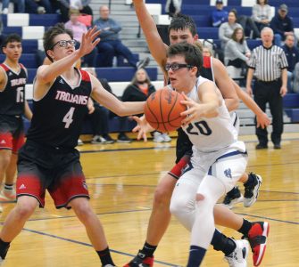 Forest Park defenders Matthew Showers (4) and Kevin Giuliani (10) try to slow down Norway’s Michael Peterson (20) who nearly loses the ball while driving to the basket during the Knight’s home win Monday in the MHSAA Division 4 District 99 opener. (Dennis Mansfield/Daily News photo)