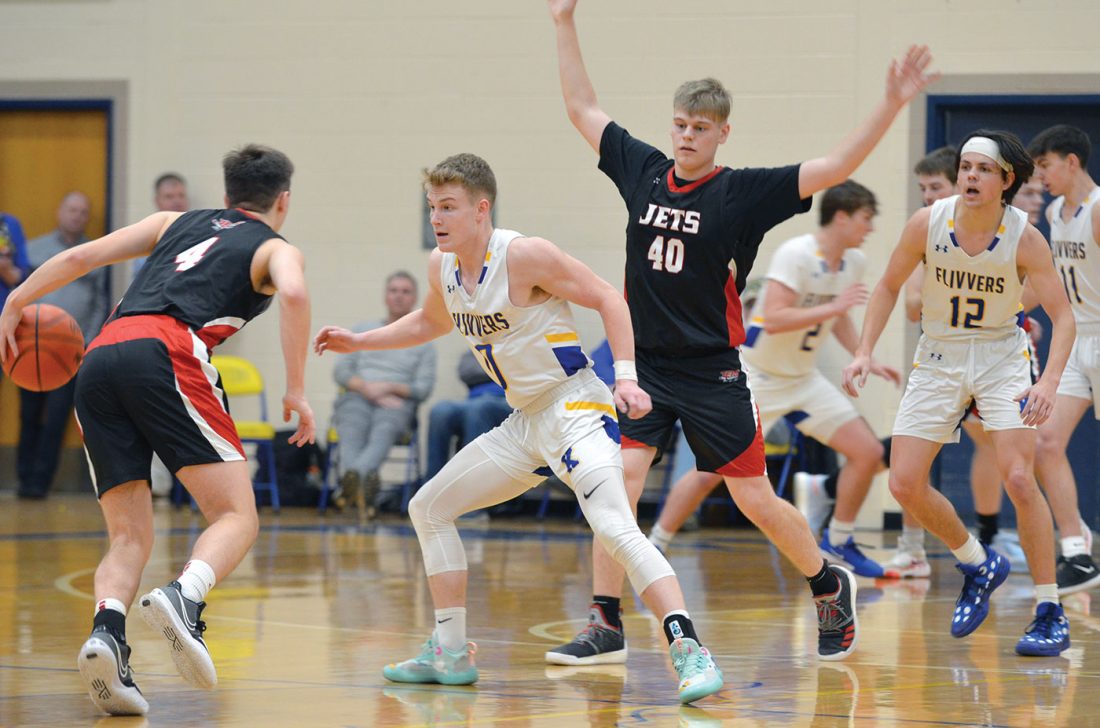 Kingsford junior guard Nic Nora (0) looks to put the defensive clamps on a North Central ballhandler during the Flivvers’ 63-48 home win over the Jets on March 1. For his efforts in helping leading the Kingsford squad, Nora was recently voted to the All-Great Northern Conference first team. (Dennis Mansfield/Daily News photo)